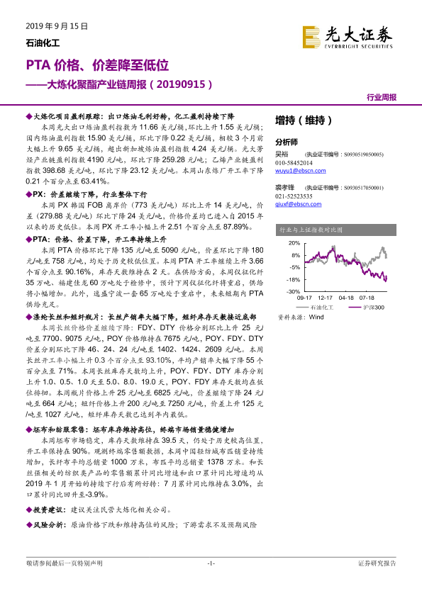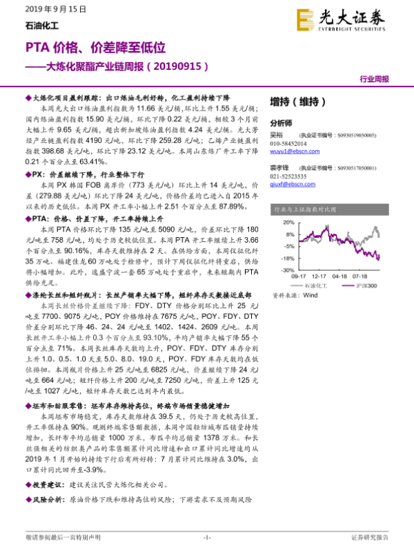 【光大证券】【20190915】20190915-光大证券-大炼化聚酯产业链周报:PTA价格、价差降至低位-13页