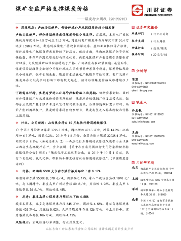 【川财证券】【20190915】20190915-川财证券-煤炭行业周报:煤矿安监严格支撑煤炭价格-15页