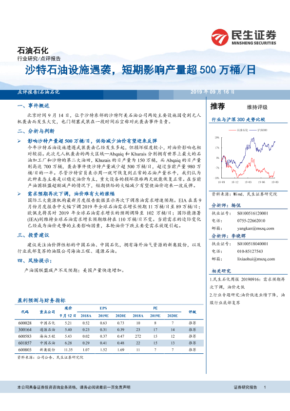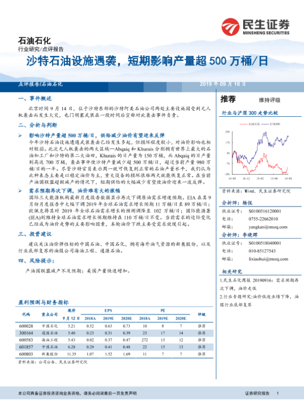 【民生证券】【20190916】石油石化点评报告:沙特石油设施遇袭,短期影响产量超500万桶日-3页