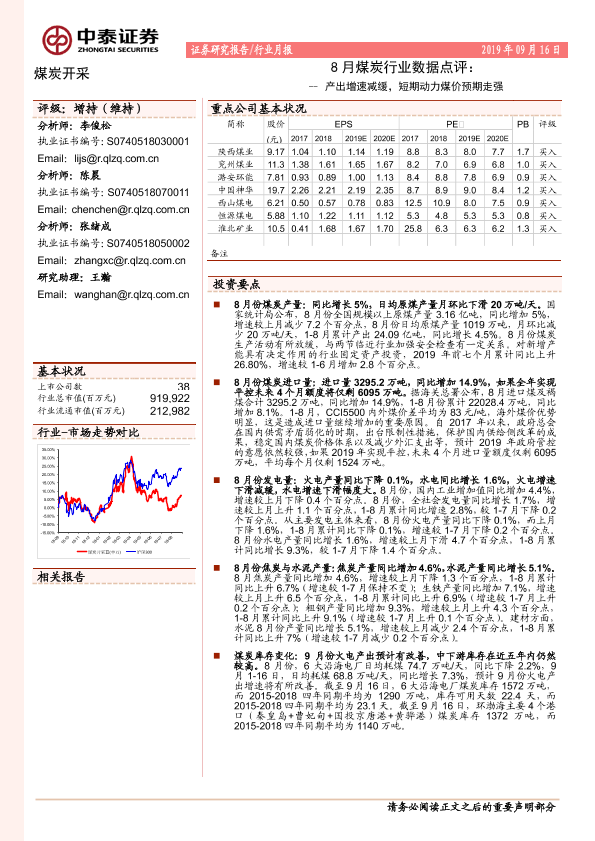 【中泰证券】【20190916】8月煤炭行业数据点评:产出增速减缓,短期动力煤价预期走强-6页