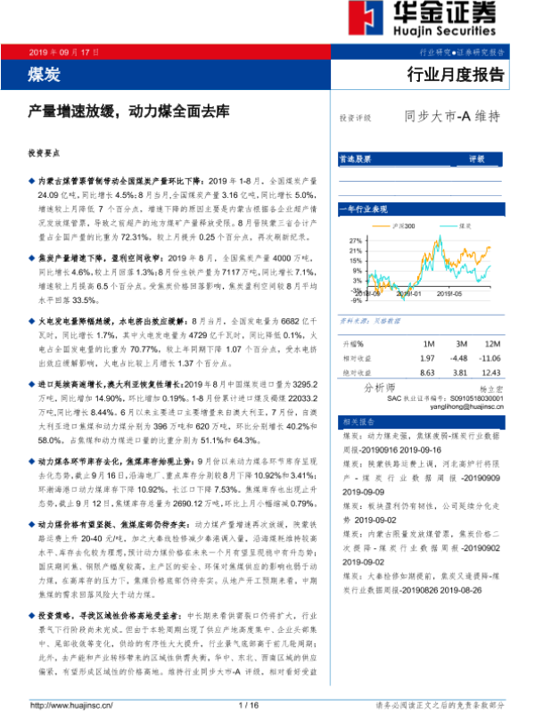 【华金证券】【20190917】20190917-华金证券-煤炭行业月度报告:产量增速放缓,动力煤全面去库-16页