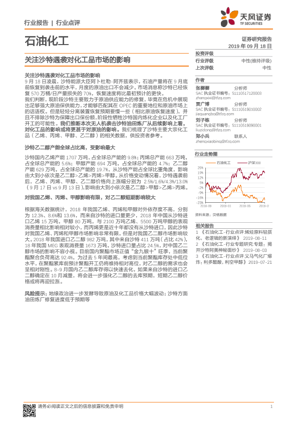 【天风证券】【20190918】石油化工行业点评:关注沙特遇袭对化工品市场的影响-7页