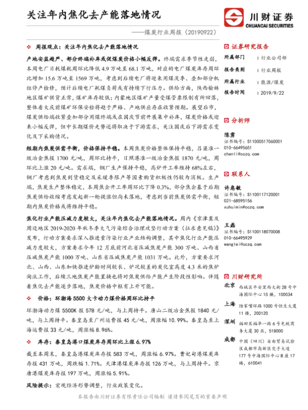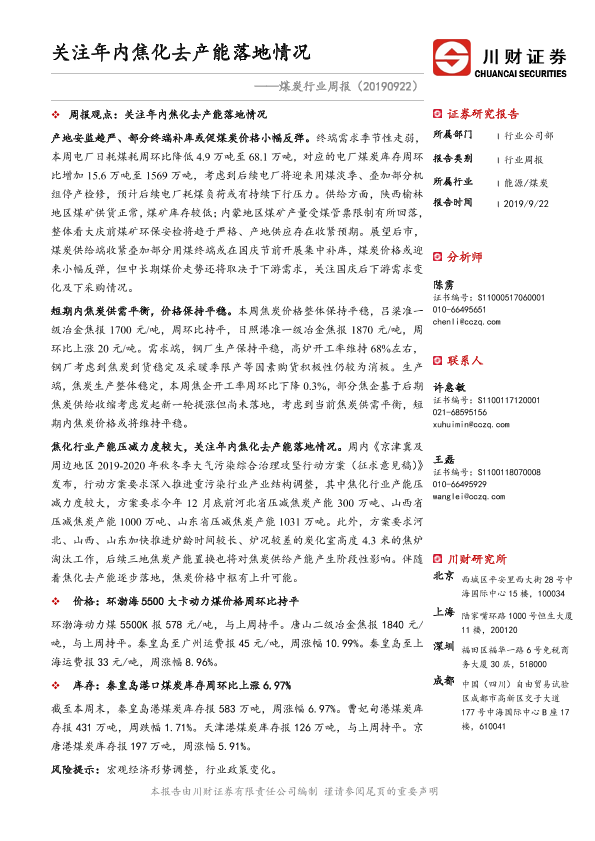 【川财证券】【20190922】煤炭行业周报:关注年内焦化去产能落地情况-15页