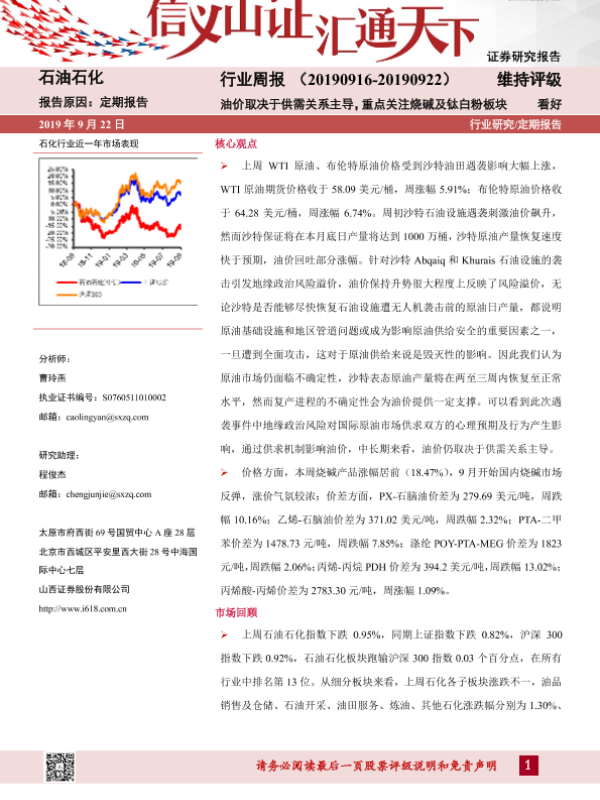 【山西证券】【20190922】石油石化行业周报:油价取决于供需关系主导,重点关注烧碱及钛白粉板块-14页