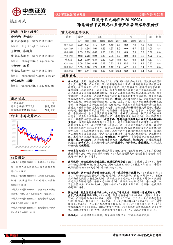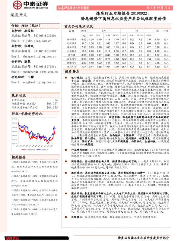 【中泰证券】【20190922】煤炭行业定期报告:降息趋势下高股息权益资产具备战略配置价值-15页