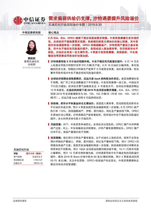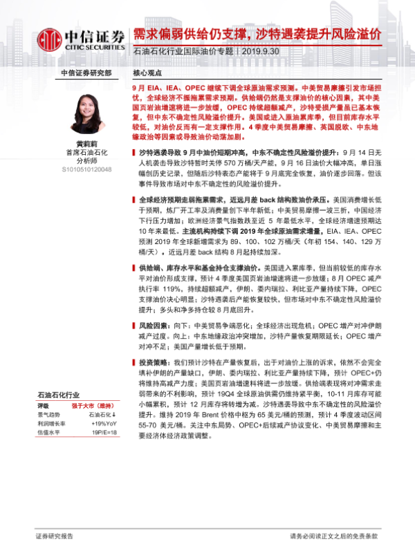 【中信证券】【20190930】石油石化行业国际油价专题:需求偏弱供给仍支撑,沙特遇袭提升风险溢价-19页