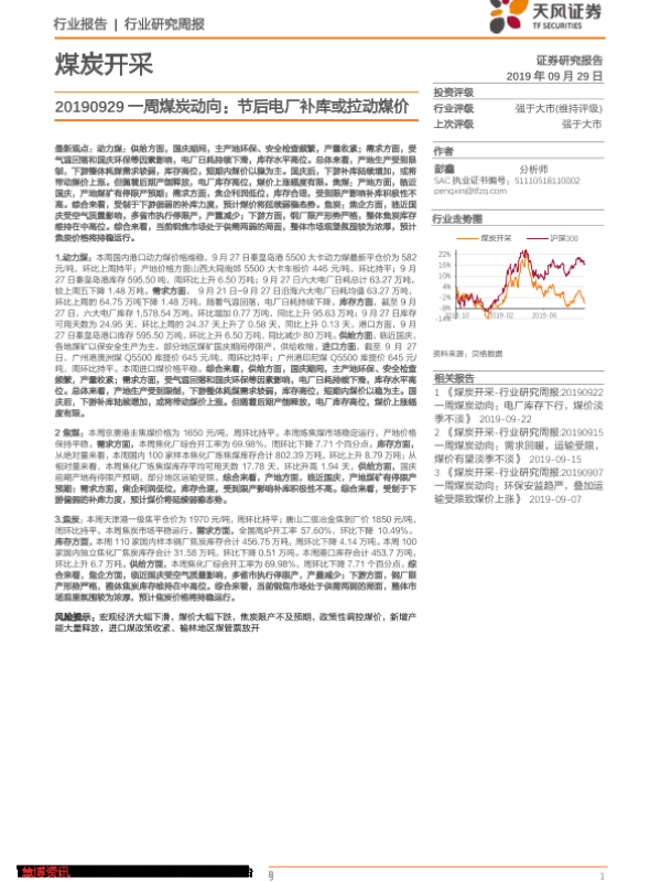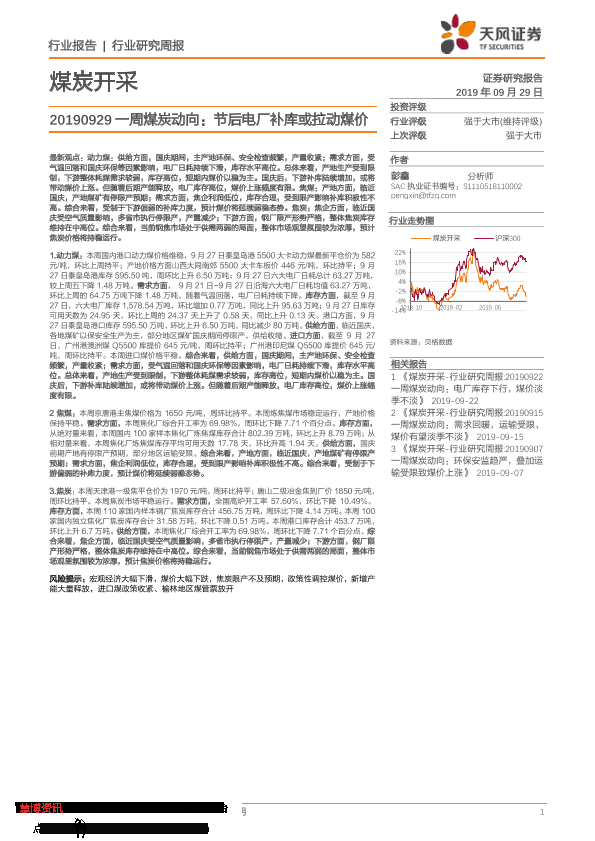 【天风证券】【20190929】20190929-天风证券-一周煤炭动向:节后电厂补库或拉动煤价-19页