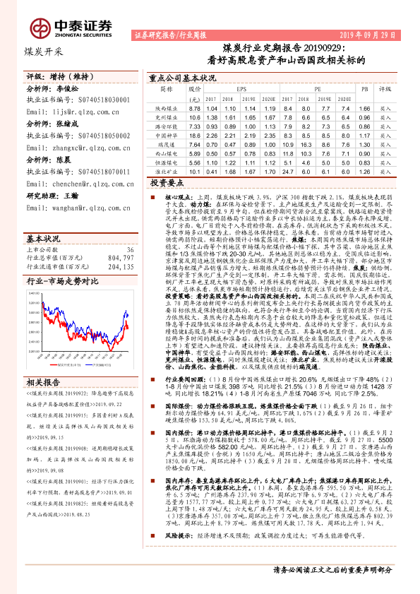 【中泰证券】【20190929】20190929-中泰证券-煤炭行业定期报告:看好高股息资产和山西国改相关标的-15页