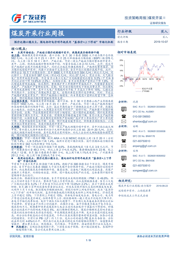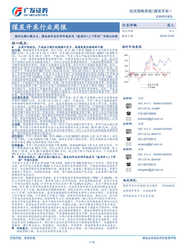 【广发证券】【20191007】煤炭开采行业周报:煤价近期以稳为主,煤电标杆电价明年起采用“基准价+上下浮动”市场化机制-9页