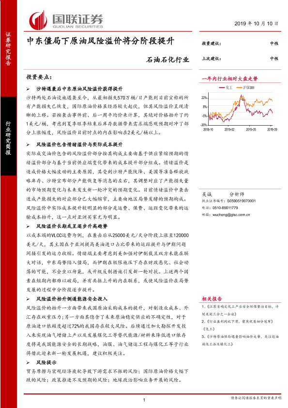 【国联证券】【20191010】石油石化行业研究简报:中东僵局下原油风险溢价将分阶段提升-3页