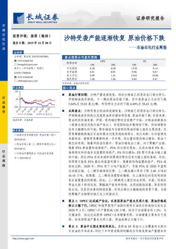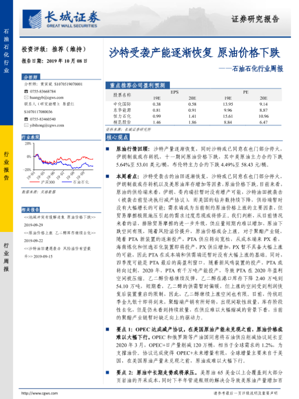 【长城证券】【20191008】20191008-长城证券-石油石化行业周报:沙特受袭产能逐渐恢复 原油价格下跌-12页