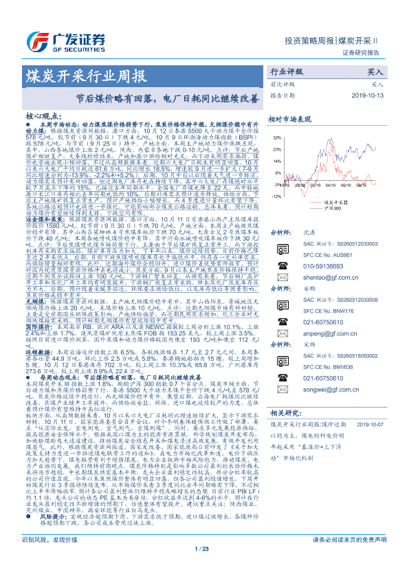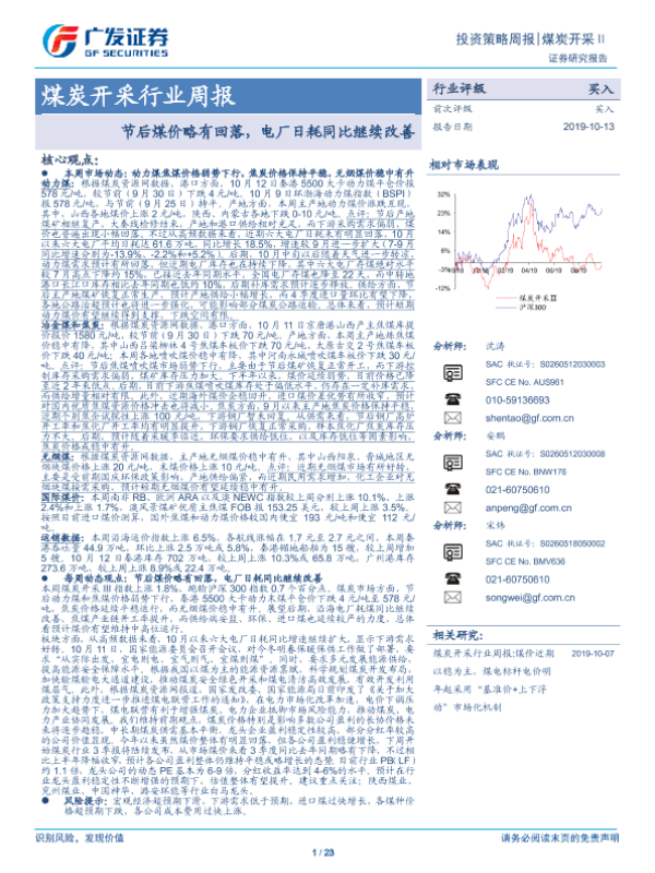 【广发证券】【20191013】20191013-广发证券-煤炭开采行业周报:节后煤价略有回落,电厂日耗同比继续改善-23页