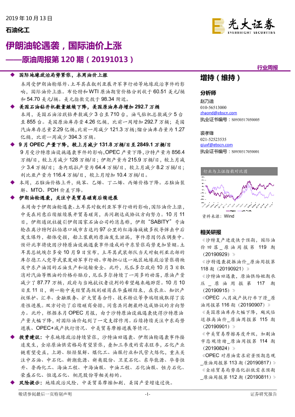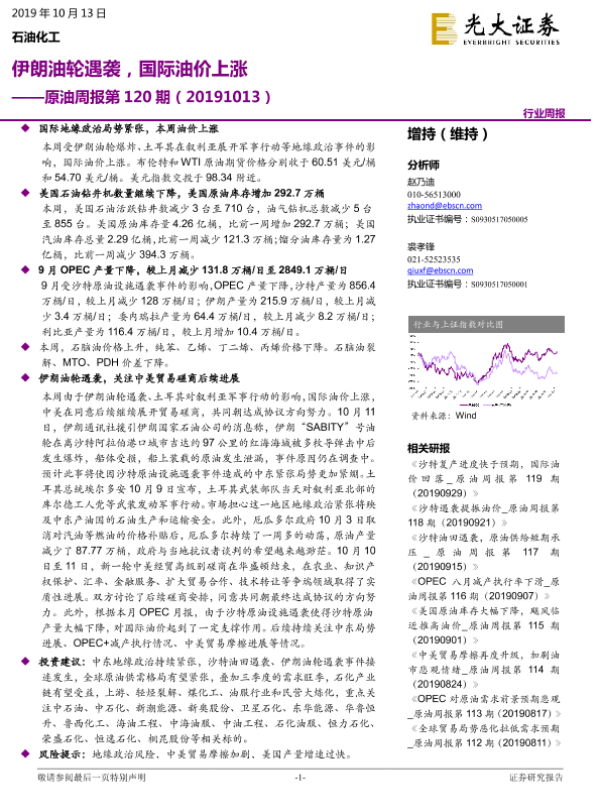 【光大证券】【20191013】原油周报第120期:伊朗油轮遇袭,国际油价上涨-12页