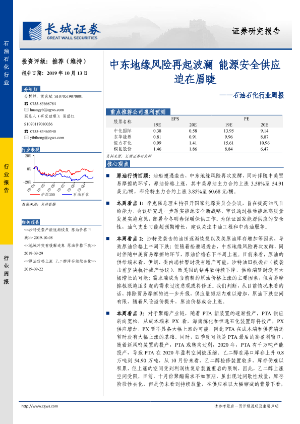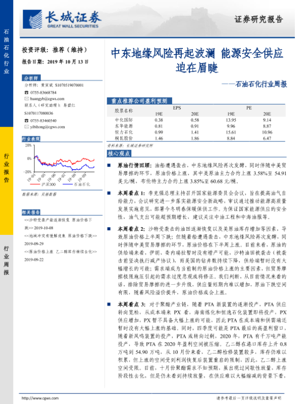 【长城证券】【20191013】石油石化行业周报:中东地缘风险再起波澜 能源安全供应迫在眉睫-11页