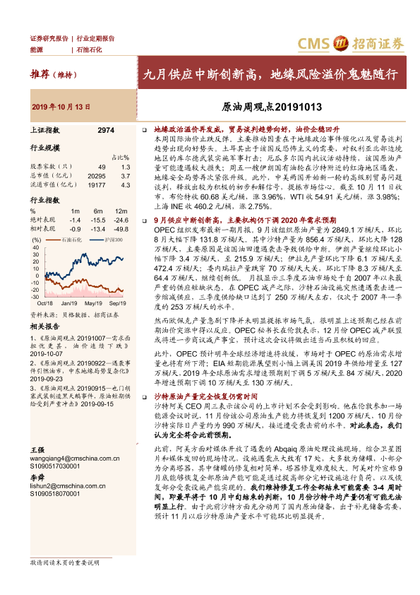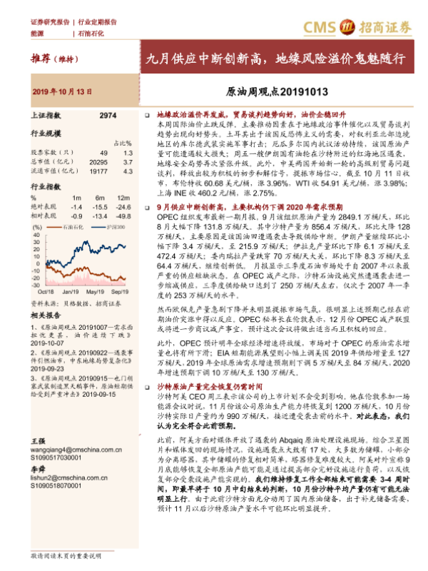 【海通证券】【20191013】原油周观点:九月供应中断创新高,地缘风险溢价鬼魅随行-16页