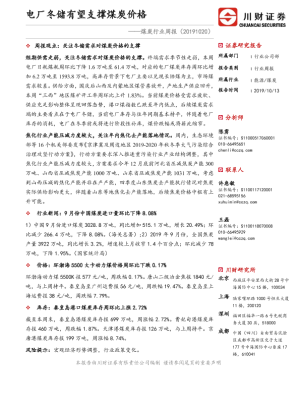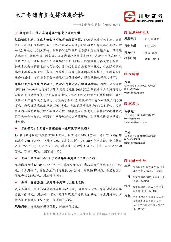 【川财证券】【20191013】20191020-川财证券-煤炭行业周报:电厂冬储有望支撑煤炭价格-14页