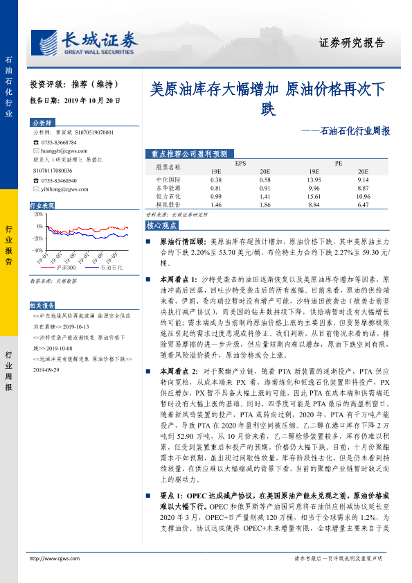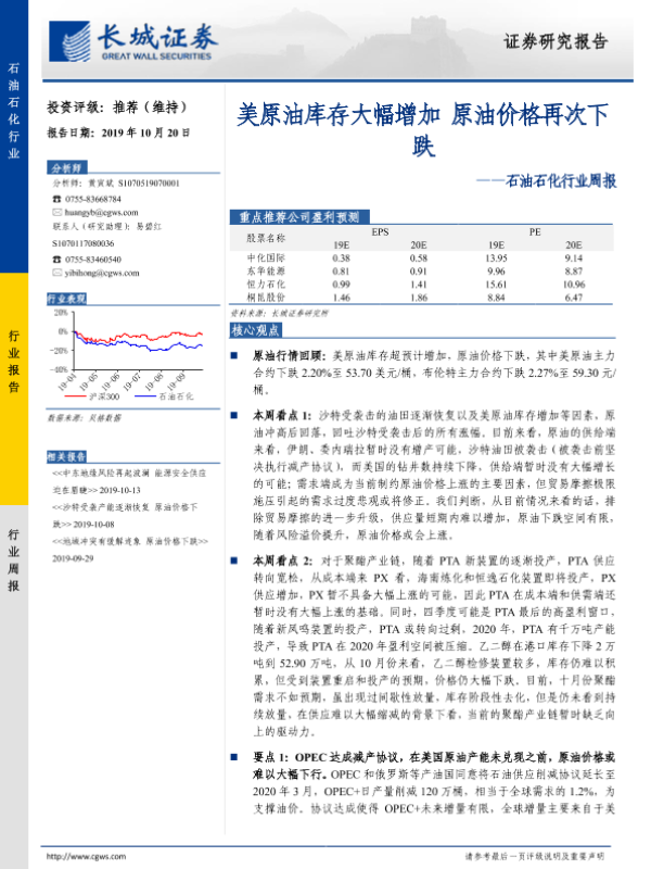 【长城证券】【20191020】石油石化行业周报:美原油库存大幅增加 原油价格再次下跌-11页