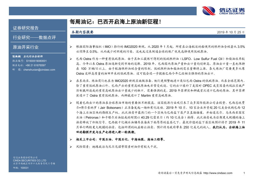 【信达证券】【20191025】每周油记:巴西开启海上原油新征程!-6页