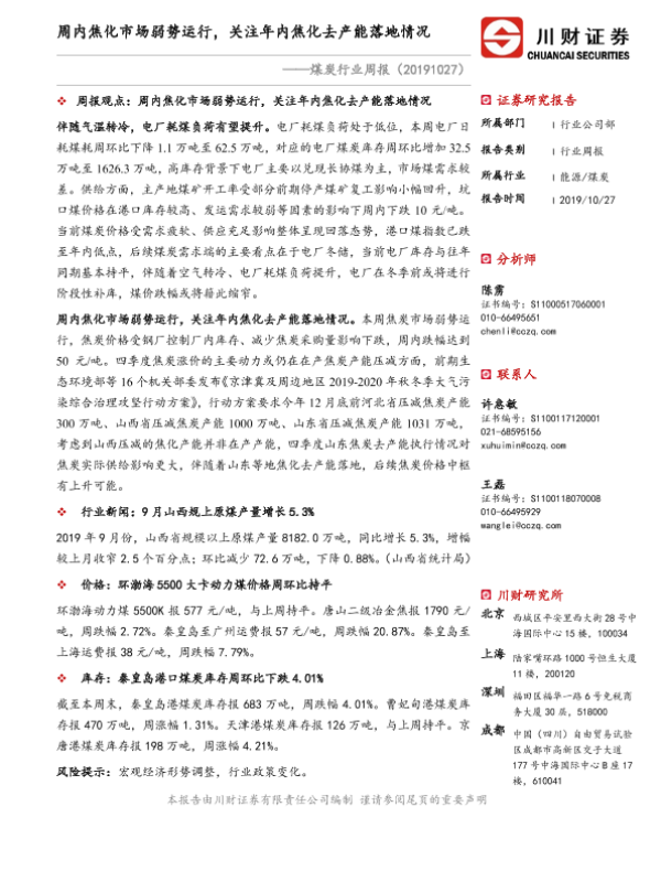 【川财证券】【20191027】20191027-川财证券-煤炭行业周报:周内焦化市场弱势运行,关注年内焦化去产能落地情况-14页