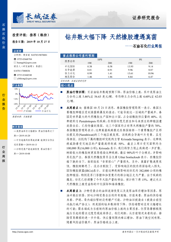 【长城证券】【20191027】20191027-长城证券-石油石化行业周报:钻井数大幅下降 天然橡胶遭遇真菌-12页