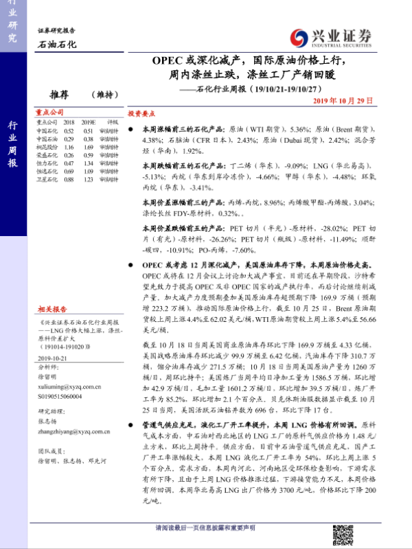 【兴业证券】【20191029】20191029-兴业证券-石化行业周报:OPEC或深化减产,国际原油价格上行,周内涤丝止跌,涤丝工厂产销回暖-12页