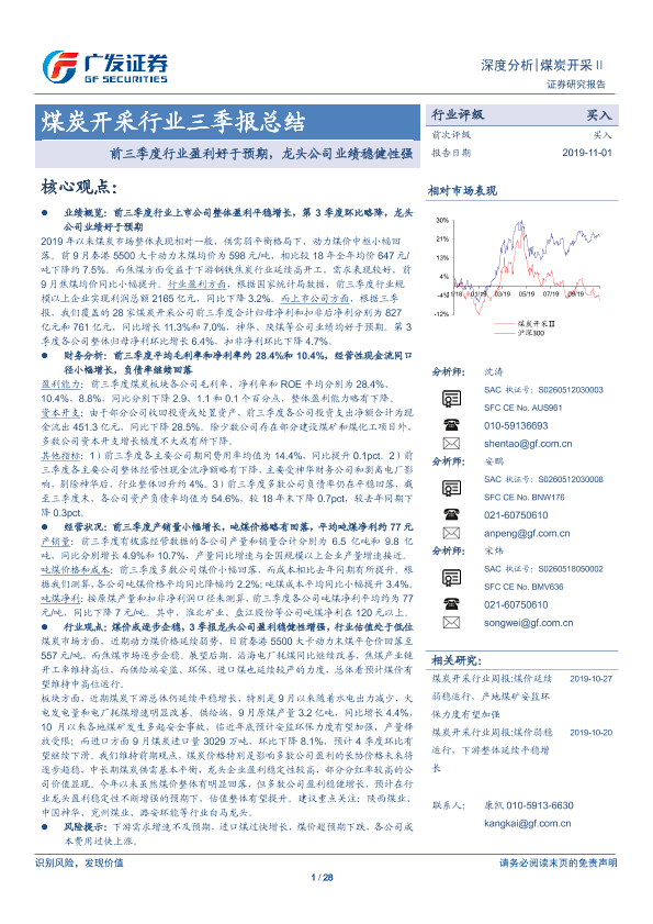 【广发证券】【20191101】20191101-广发证券-煤炭开采行业三季报总结:前三季度行业盈利好于预期,龙头公司业绩稳健性强-28页