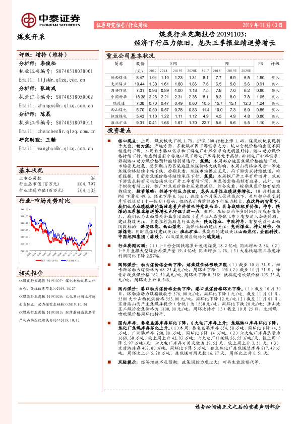 【中泰证券】【20191103】20191103-中泰证券-煤炭行业定期报告:经济下行压力依旧,龙头三季报业绩逆势增长-15页