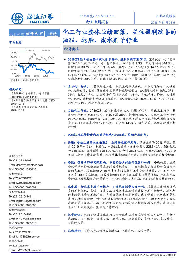 【海通证券】【20191104】20191104-海通证券-石油化工行业专题报告:化工行业整体业绩回落,关注盈利改善的油服、轮胎、减水剂子行业-19页
