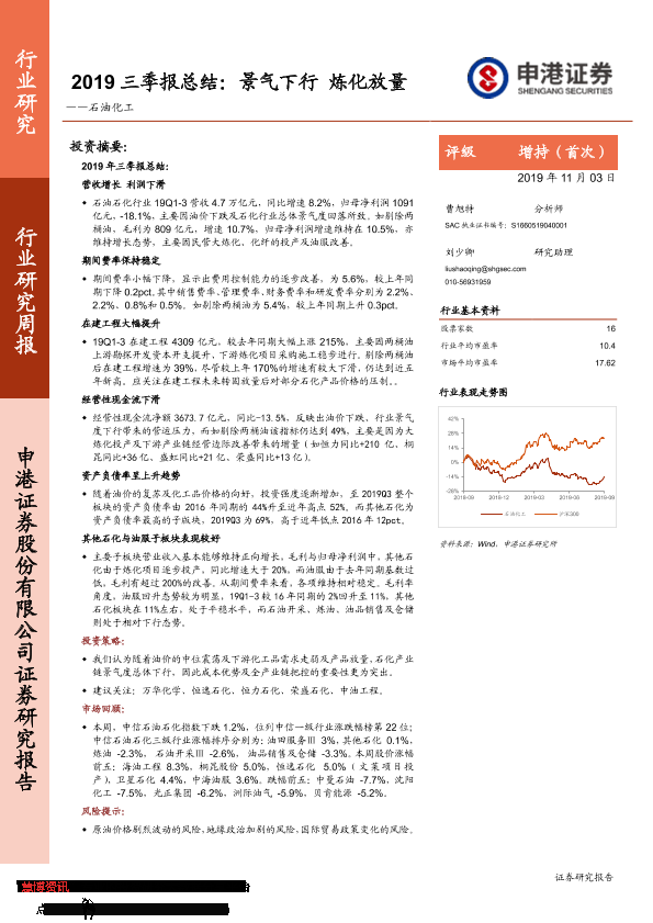 【申港证券】【20191103】2019三季报总结:景气下行 炼化放量——石油化工-26页