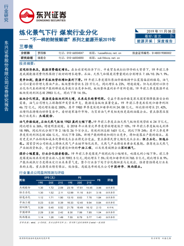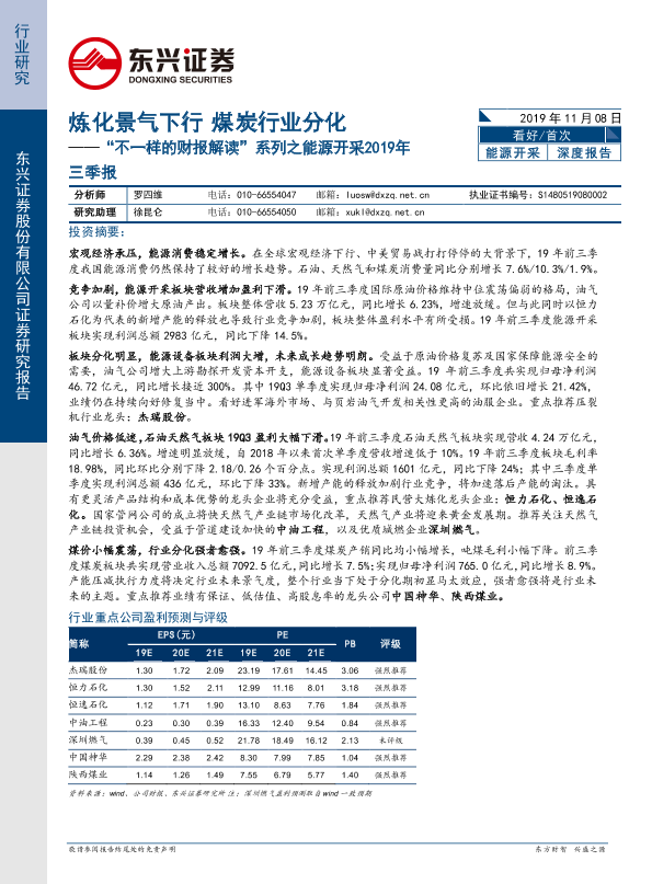 【东兴证券】【20191108】“不一样的财报解读”系列之能源开采2019年三季报:炼化景气下行 煤炭行业分化-18页