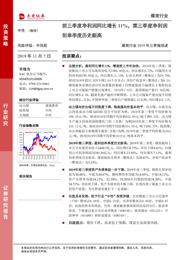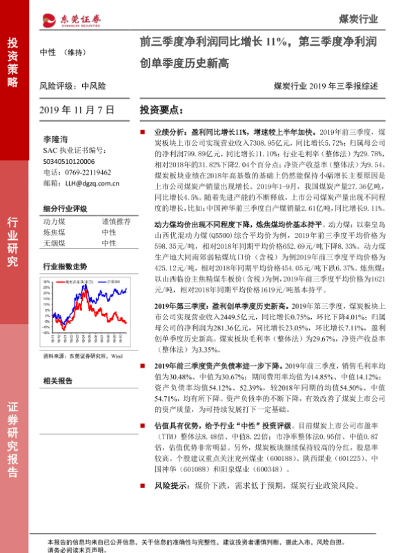 【东莞证券】【20191107】煤炭行业2019年三季报综述:前三季度净利润同比增长11%,第三季度净利润创单季度历史新高-10页
