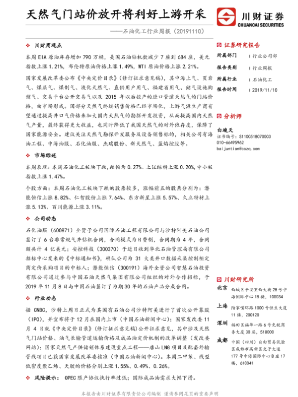 【川财证券】【20191110】20191110-川财证券-石油化工行业周报:天然气门站价放开将利好上游开采-12页