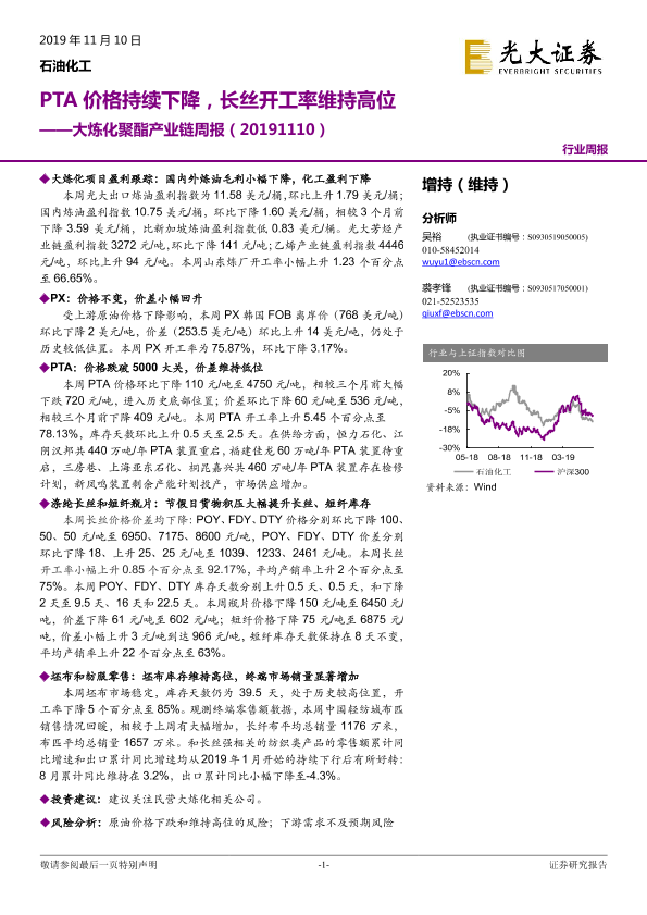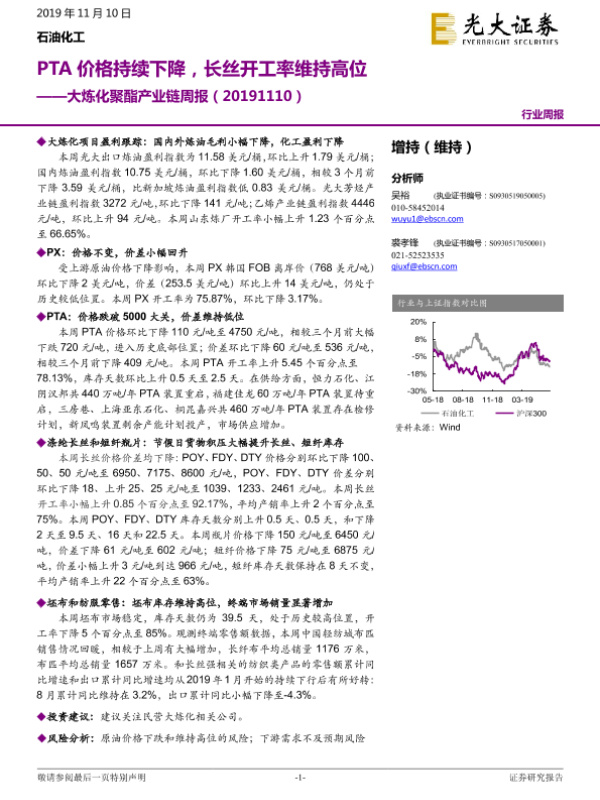 【光大证券】【20191110】大炼化聚酯产业链周报:PTA价格持续下降,长丝开工率维持高位-13页