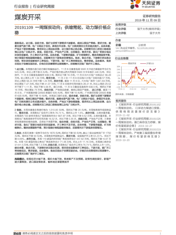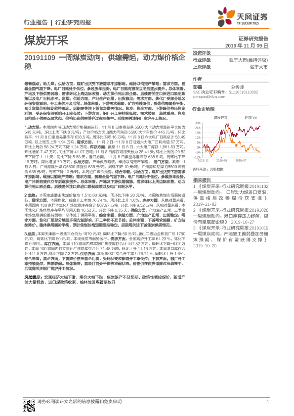 【天风证券】【20191109】20191109-天风证券-一周煤炭动向:供缩需起,动力煤价格企稳-19页