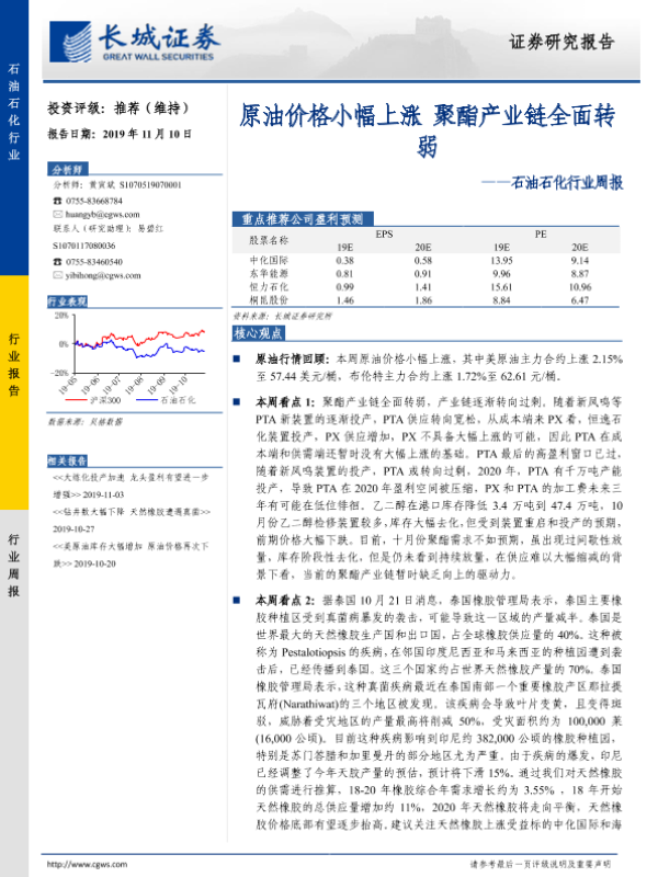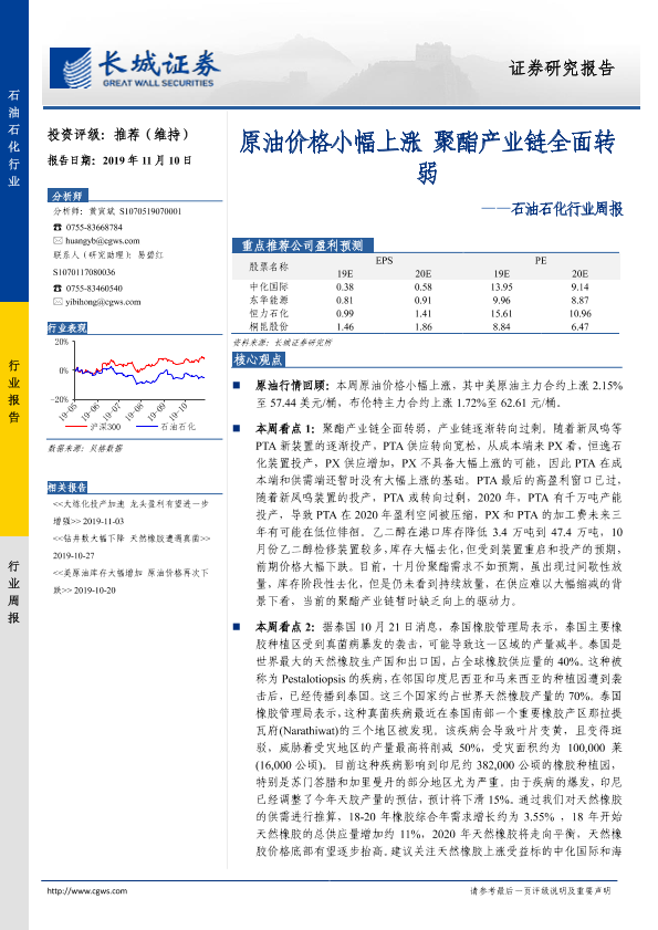 【长城证券】【20191110】20191110-长城证券-石油石化行业周报:原油价格小幅上涨 聚酯产业链全面转弱-12页