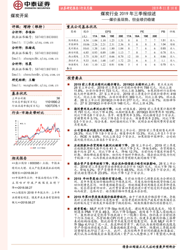 【中泰证券】【20191110】煤炭行业2019年三季报综述:煤价虽弱势,但业绩仍稳健-15页
