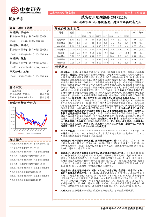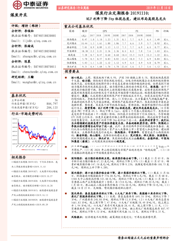 【中泰证券】【20191110】20191110-中泰证券-煤炭行业定期报告:MLF利率下降5bp体现态度,建议布局高股息龙头-15页