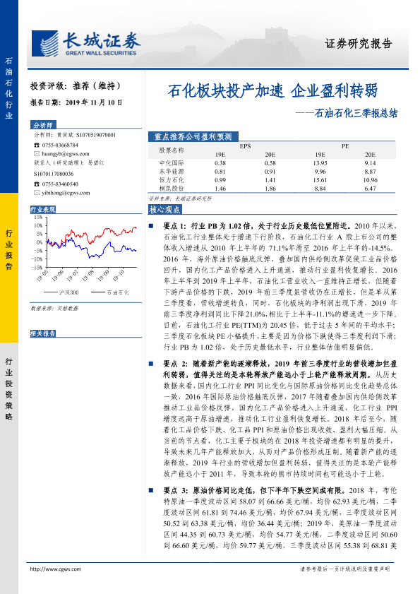 【长城证券】【20191110】石油石化三季报总结:石化板块投产加速 企业盈利转弱-14页