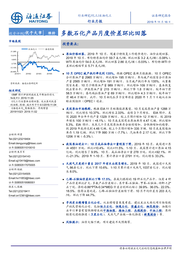 【海通证券】【20191116】20191116-海通证券-石油化工行业月报:多数石化产品月度价差环比回落-9页
