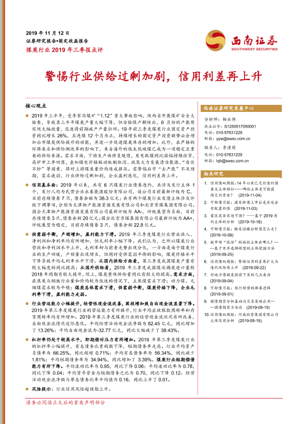 【西南证券】【20191112】2019年三季报点评:警惕行业供给过剩加剧,信用利差再上升-17页