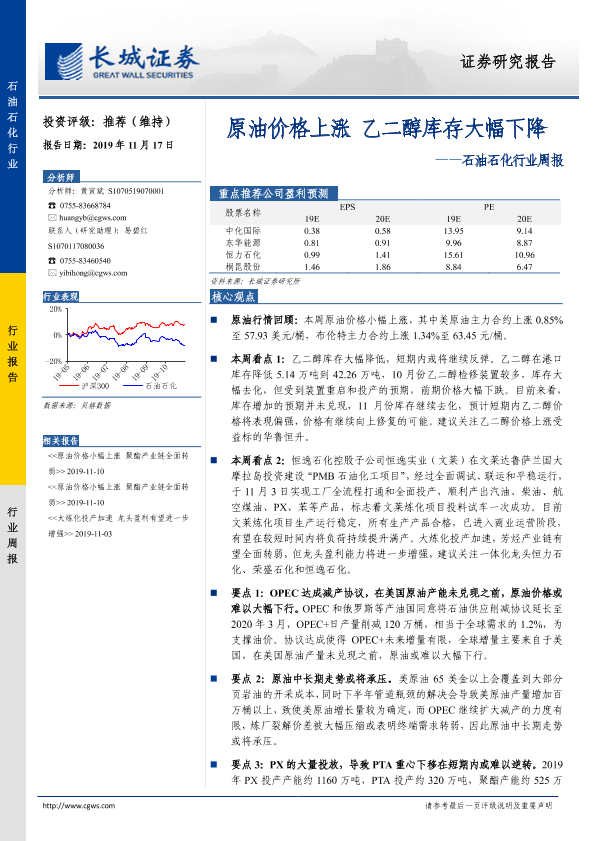 【长城证券】【20191117】20191117-长城证券-石油石化行业周报:原油价格上涨 乙二醇库存大幅下降-10页