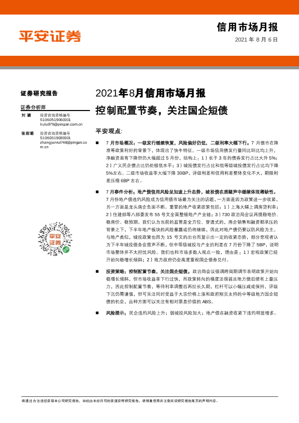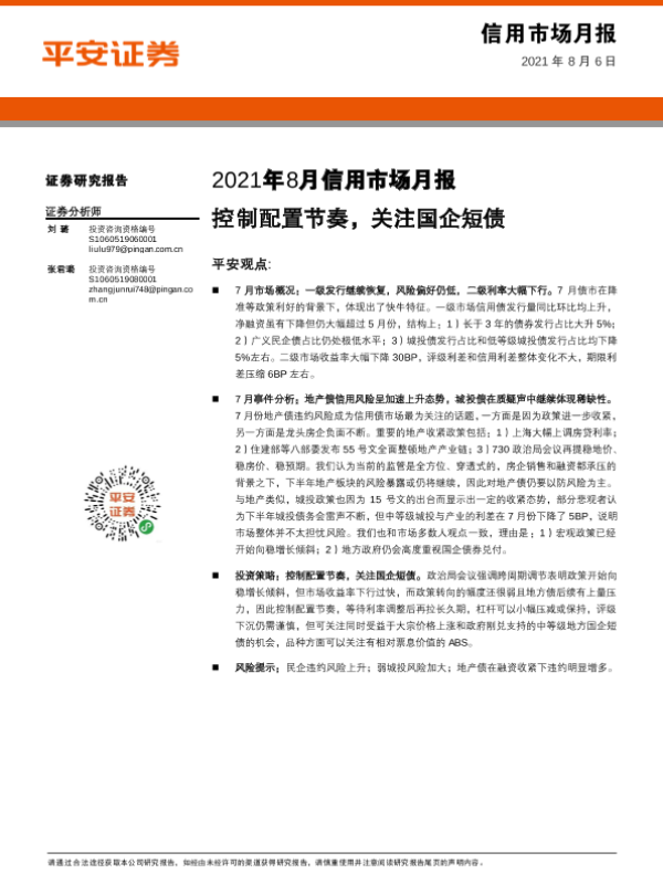 【平安证券】【20210806】2021年8月信用市场月报:控制配置节奏,关注国企短债-16页