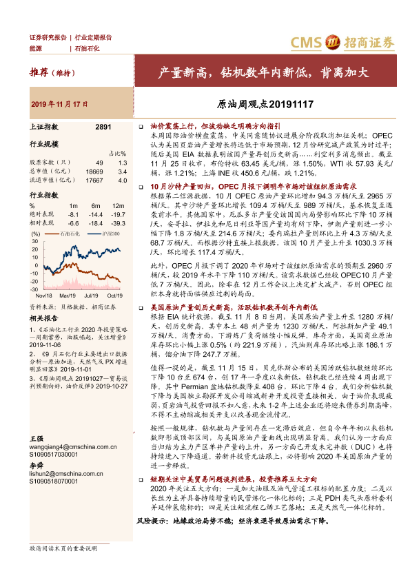 【海通证券】【20191117】原油周观点:产量新高,钻机数年内新低,背离加大-15页