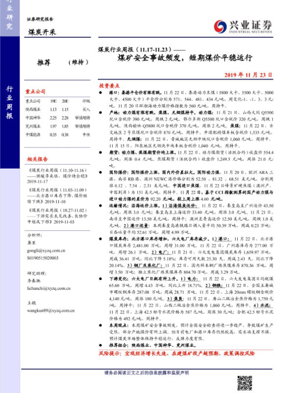 【兴业证券】【20191123】煤炭行业周报(11.17-11.23)——煤矿安全事故频发,短期煤价平稳运行-20页