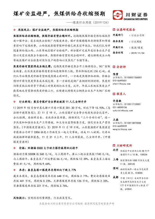 【川财证券】【20191124】煤炭行业周报:煤矿安监趋严,焦煤供给存收缩预期-14页