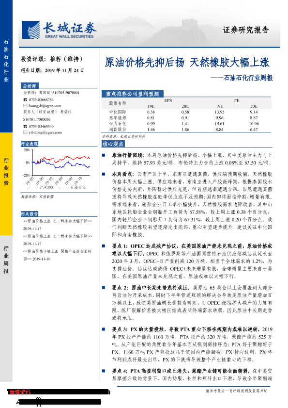 【长城证券】【20191124】石油石化行业周报:原油价格先抑后扬 天然橡胶大幅上涨-10页