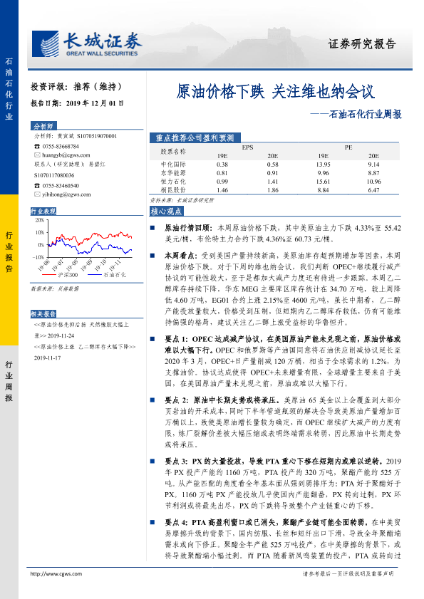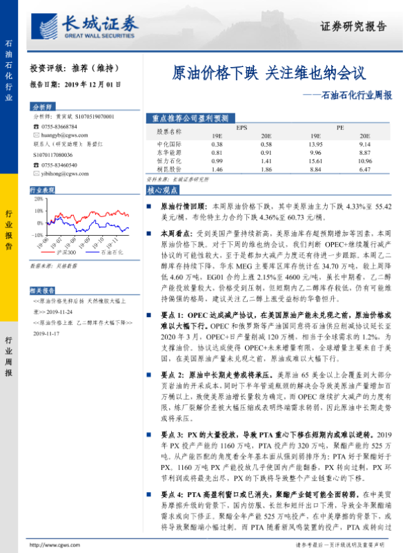 【长城证券】【20191201】石油石化行业周报:原油价格下跌 关注维也纳会议-10页