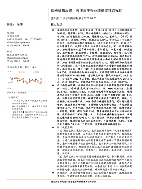 【首创证券】【20221023】基础化工行业简评报告:硫磺价格反弹,关注三季报业绩确定性强标的-17页