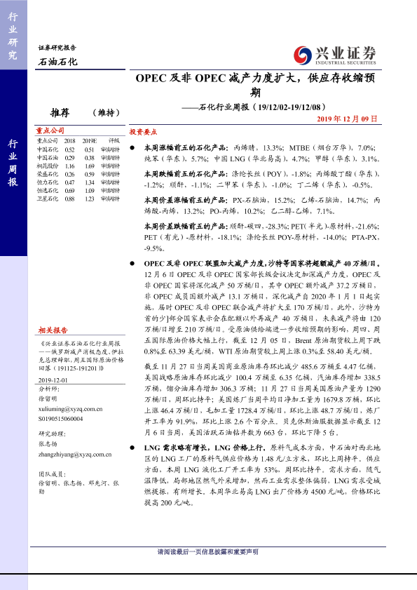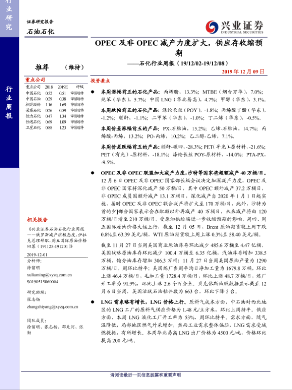【兴业证券】【20191209】20191209-兴业证券-石化行业周报:OPEC及非OPEC减产力度扩大,供应存收缩预期-12页