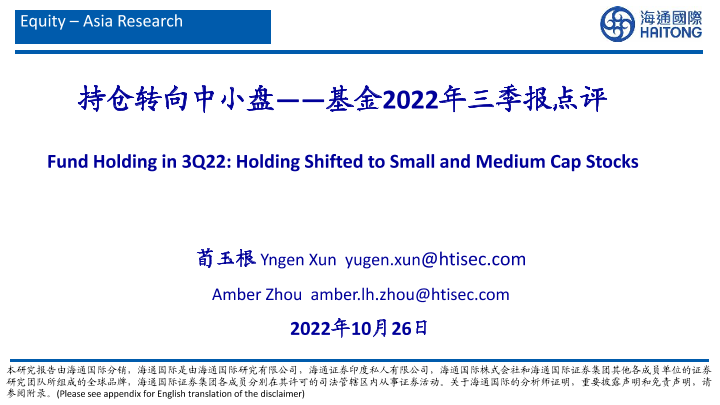 【海通国际】【20221026】基金2022年三季报点评:持仓转向中小盘-38页